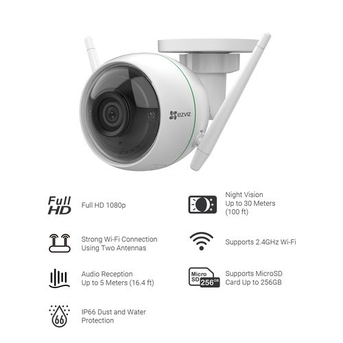 EZV-CM-EZVC3WN-WTThe EZVIZ C3WN Wi-Fi Outdoor Smart Home Security Camera with Smart Detection Zones keep an eye on your property at all time! The dual Wi-Fi antennas ensure that the camera is connected, so that your property is protected at all times and with 1080p high definition video resolution, 1-way audio capability, and smart motion detection configurations, this entry-level outdoor smart security camera is an ideal addition to any home, without breaking the bank.